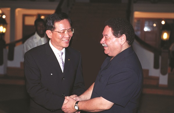 梅尼士總統(右)與洪道子博士(左)開心握手,並在總統官邸設宴款待親訪團。