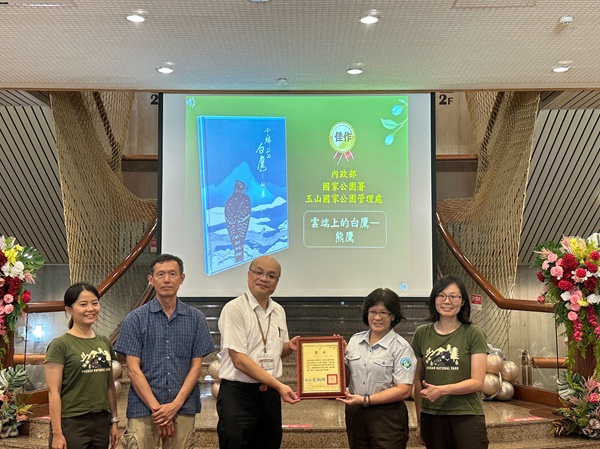 孫元勳(左二)團隊及玉山國家公園管理處、導演梁皆得合作的《雲端上的白鷹》榮獲國史館 文獻書刊佳作獎。