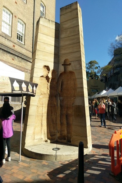 岩石區市場邊矗立著一座登陸紀念碑,三面共刻著軍人、貴族與犯人,這三類人為澳洲開疆闢土的先驅。