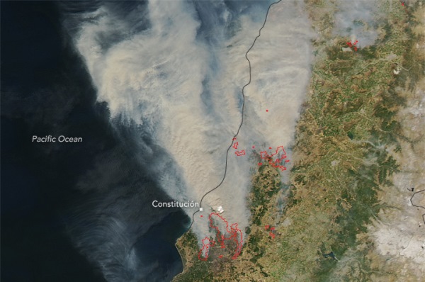 智利遭到山火肆虐已逾二個月,最近數週,森林大火更快速延燒,燃燒面積有19萬公頃,大約是7個台北市的大小,濃煙亦籠罩智利太平洋沿岸約300公里。大火造成至少6死,4千人被迫疏散,學校及數百棟建築付之一炬。有環保人士稱,是因為氣候變化引發乾旱,導致大火更加劇烈;但智利林業局局長指出,部份大火有可能是人為造成。