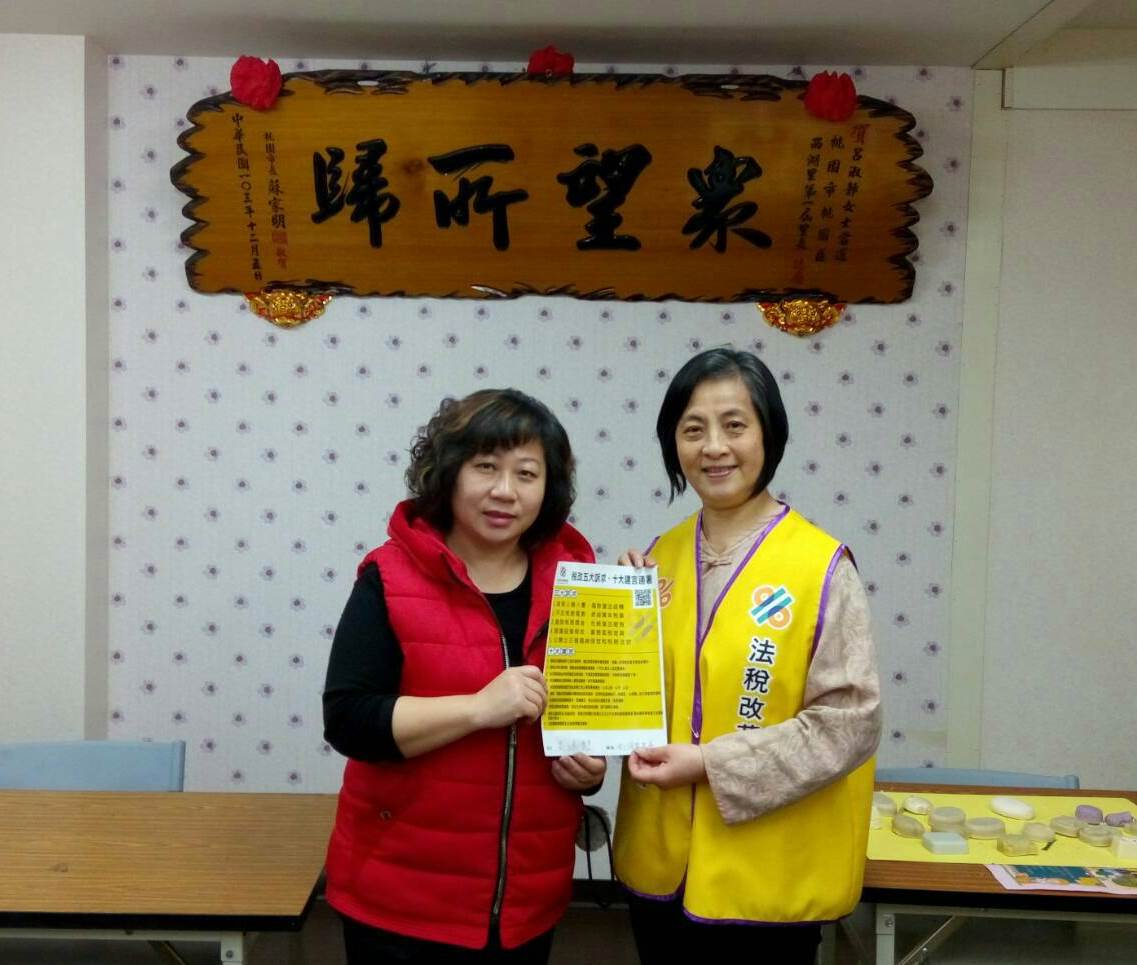 中信里里長林國政、西湖里里長呂淑靜(右圖)、永安里里長莊育達、汴洲里里長楊鑫坤及文昌里里長陳銘福皆共同響應連署稅改十大建言。截至目前為止,桃園區76里共有67位里長支持連署稅改十大建言。永安里里長莊育達(左圖)表示,台灣的稅制存在許多問題,法稅改革聯盟的志工為公眾的事上山下海、全國走透透,他很感佩志工們的精神。