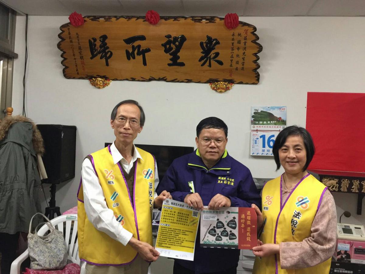 法稅改革聯盟志工,這個禮拜來到桃園區中信里、西湖里、永安里、汴洲里及文昌里里民辦公處,向里長傳達人民的心聲。國稅局稅務人員開稅單,本來就是職責內該做的事,但國稅局卻編列1.2億元的稅務獎勵金,獎勵稅務人員多多開稅單,領獎金,造成烏龍稅單滿天飛,人民苦不堪言。國家經濟不振,近四年來卻可以從人民身上超徵五千多億,把人民當提款機。國家應該要退還超徵稅收,減輕人民經濟壓力。不公開、不透明的稅制,也讓外資不敢來台灣投資,台灣的年輕人沒有工作機會,人才都到國外就業。
