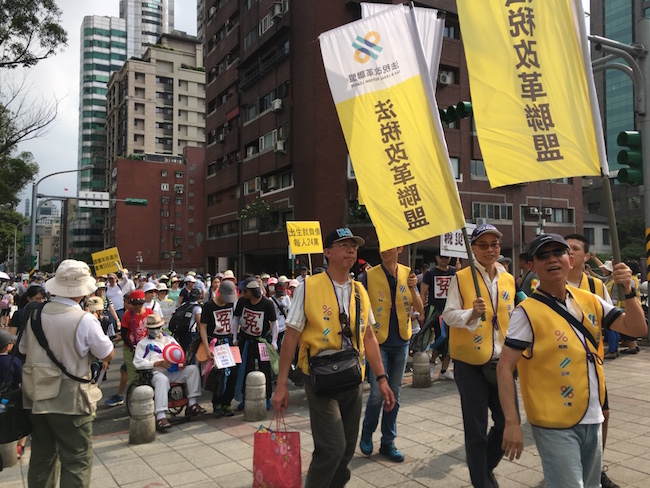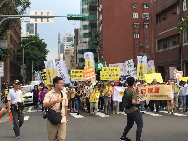 在38.2度高溫的台北市區,從四面八方來共襄盛舉的民眾與法稅志工超過8千人,不畏炎熱一起帶著鬧鐘參加大遊行。遊行隊伍沿途高舉標語呼口號,希望叫醒沉睡的政府,喚醒「昏迷指數」爆高的台灣。