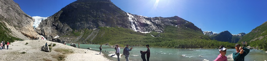 最後抵達布麗斯達冰河,壯麗的冰河景觀呈現在眼前。近年溫室效應不斷發效,地球上的冰河正以驚人的速度消失,這種狀況在高緯度地區和高海拔地區格外明顯。據說十年前的冰河是往更下方一大片滑落,現在則又減少了三分之一。