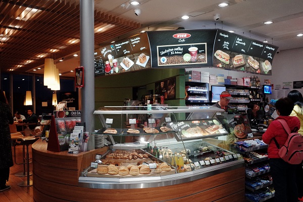 餐廳飲食簡單,咖啡、茶等飲料外,就只有三明治、麵包等;有時連餐廳都沒有,那就只有架上的三明治麵包而已。