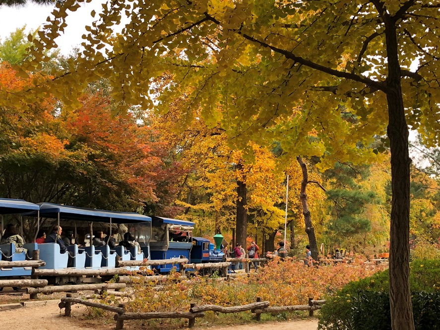 這季節登上南怡島,撲面而來的就是一片豔黃,銀杏路上種滿的銀杏樹,樹幹粗大強壯,秋天換上金黃色的衣裳,在陽光照耀下金光閃閃,奪目耀眼,很有秋天的感覺,葉縫間滲出一點柔和的陽光,很溫暖。在這條銀杏路上散步是一件非常浪漫的事,但這條路上人潮很多,一邊走一邊要閃避,想要拍張無人的照片簡直就是不可能的任務。