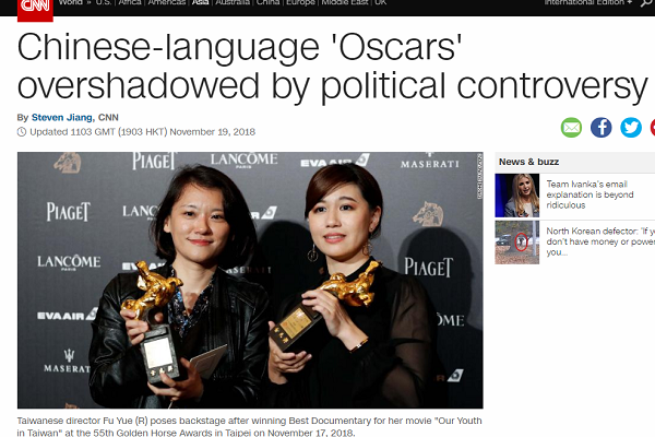 本屆金馬獎最佳紀錄片導演、得獎的36歲女導演傅榆在頒獎當天的致詞,及頒獎人–中國演員涂們的「中國台灣」稱號,意外引起的兩岸政治議題交鋒;美國有線電視新聞網(CNN)19日的版面,以「中文版的“奧斯卡”因政治爭議蒙上陰影」為題大幅刊登報導。