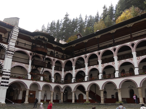 保加利亞首都索菲亞西南方117公里,有座由隱士rila(里拉)的聖約翰與他的學生興建的里拉修道院(rila monastery)。修道院位於巴爾幹半島最高峰里拉山的里奧斯卡山谷中,海拔1147米,占地約8800平方米,是巴爾幹半島最大的修道院。這座新拜占庭風格建築始建於公元10世紀中期,以神聖精彩的濕壁畫聞名,教堂外牆壁畫於1846年繪製完成,是來自全國各地知名畫師的集體精心創作。1983年聯合國教科文組織宣布為世界文化遺產。