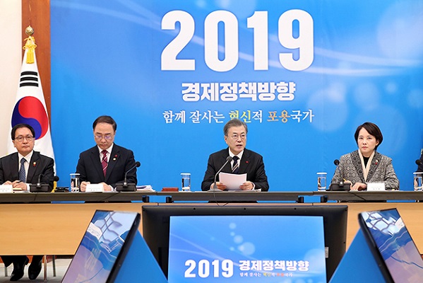 12月17日,文在寅主持的擴大經濟長官會議,確定了以“國民收入3萬美元時代,共同富裕的革新包容國家”為基礎的2019年經濟政策方向。這是文在寅就任總統以來首次主持擴大經濟長官會議。將投入6兆以上韓元促進大規模企業投資專案早期開工,投入8.6兆韓元的地區密集型生活社會間接資本(SOC)事業,以提前支付預算或提高國庫補助率的方式加快財政投資。