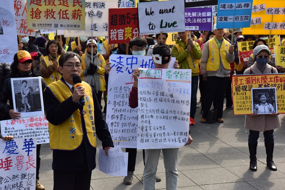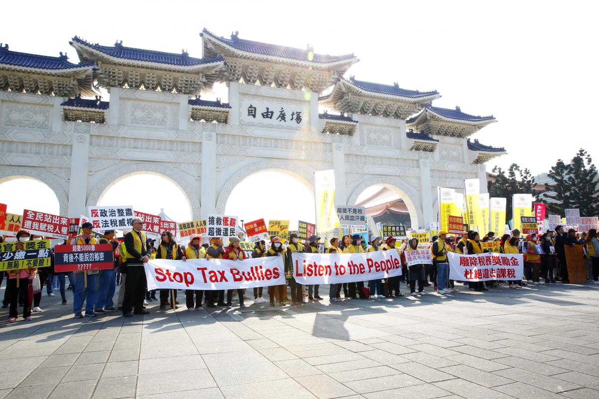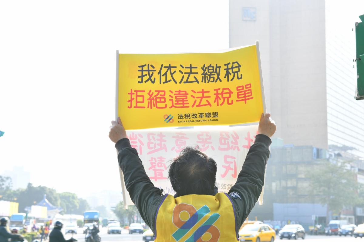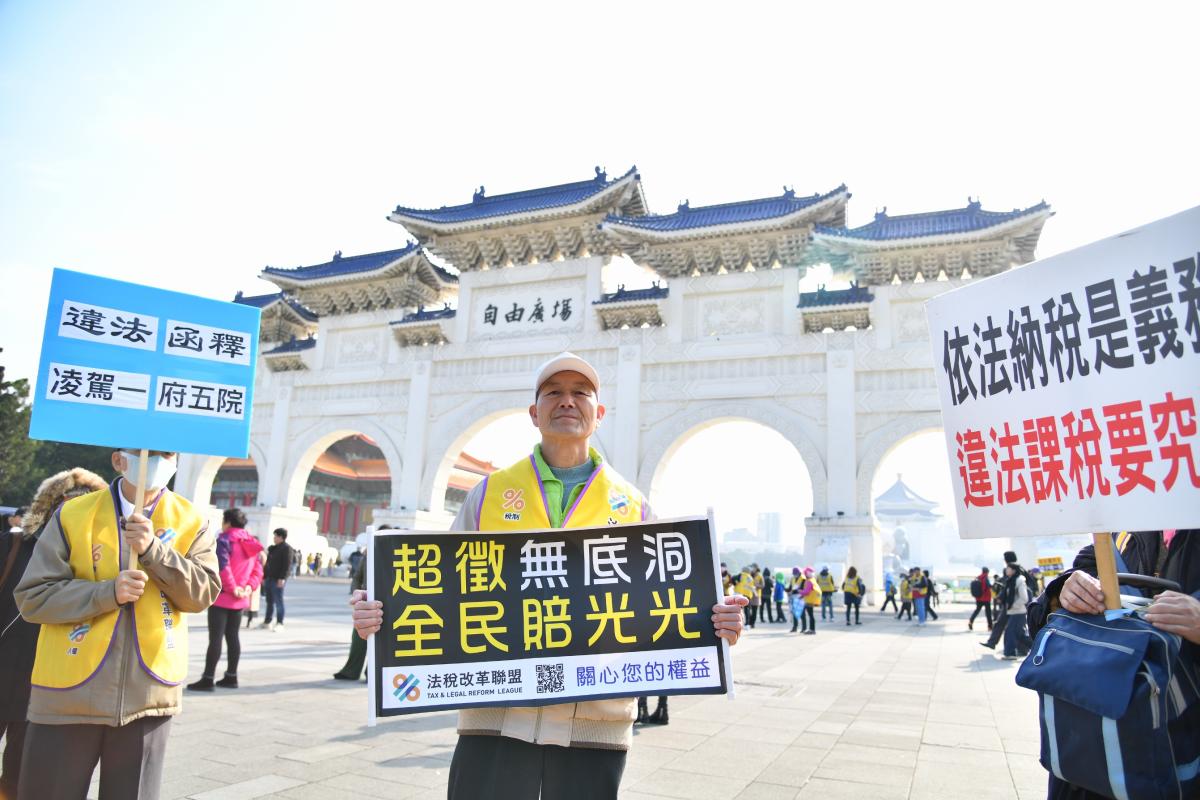 政府五年稅收超徵六千億,然超徵流向卻不透明,為此,身穿黃背心的法稅改革聯盟志工聚集自由廣場,除要追討超徵紅包,為生存、要自由怒吼,並控訴台灣稅災氾濫,連已往生的人都還連年收到錯誤稅單;活動現場更公開財稅幫五大惡人惡行,剝奪台灣人民自由,凌駕一府五院職權,憤怒群眾高喊「財稅幫滾出台灣,停止霸凌台灣人民」!