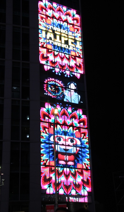 今年主題燈「百變豬寶亮晶晶」,柯市長覺得造型怪怪的,大概因為它不走傳統可愛風,只取意象加上數位影像技術,豬寶寶因此會隨意變換表情。