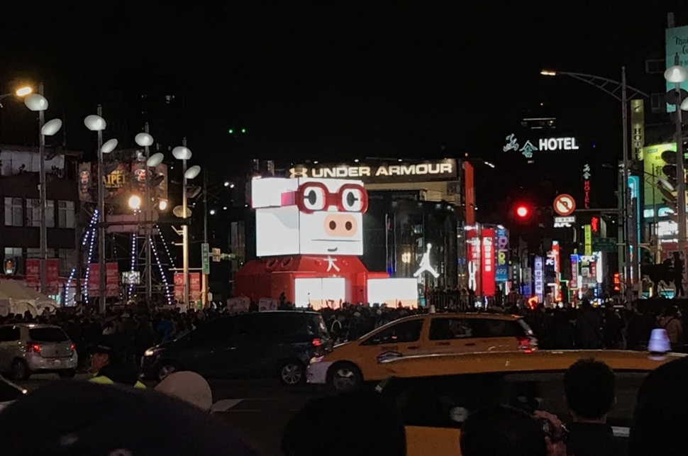 捷運西門站十字路口的大樓電視牆,也同步轉播現場活動。從畫面可以了解,主場是人山人海。