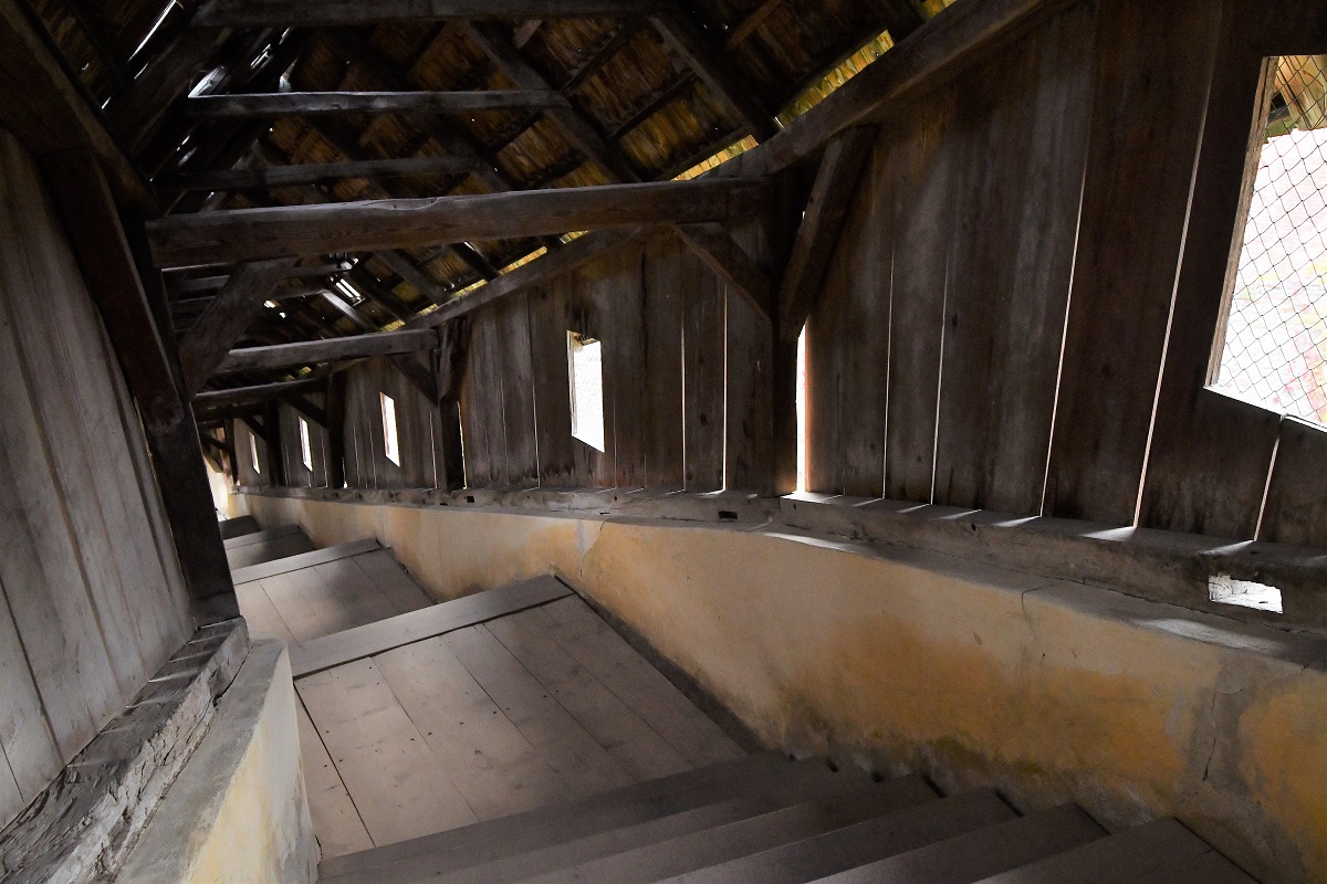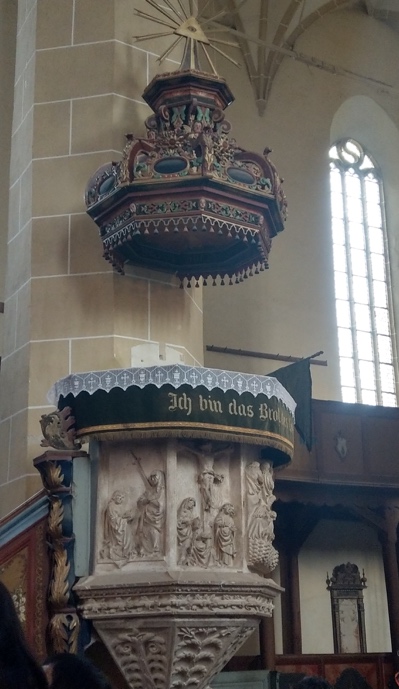 錫吉什瓦拉城最有價值的建築古蹟之一~山頂上的福音派教會,興建於12~16世紀。挑高的建築,在頌唱聖樂時能營造和諧共鳴的樂聲。高聳的石柱上更有美麗的雕刻與精緻的講台設計供神父傳道之用。坐在教堂裡的木雕椅上,置身其中,彷彿回到中世紀戰亂中尋求精神寄託的民眾。沿山而建的稍陡峭山坡,加上圓拱形的建築物,當時的居民做禮拜就像朝聖般一步步地往上爬。