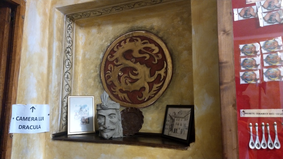 進城需拾階而上,穿過城門可以看到高大的鐘樓與鐘樓廣場,旁邊有一棟黃色老屋,門口掛著龍的標誌,這就是人稱吸血鬼的弗拉德公爵(Vlad al III-Lea Tepes Dracula 弗拉德三世 采佩什 德古拉)的出生地。英國小說家以其樣貌編寫成吸血鬼小說《驚情四百年》名聞天下。這棟黃色建築物現在改裝為餐廳,2樓還有壁畫與當時的武器陳列。