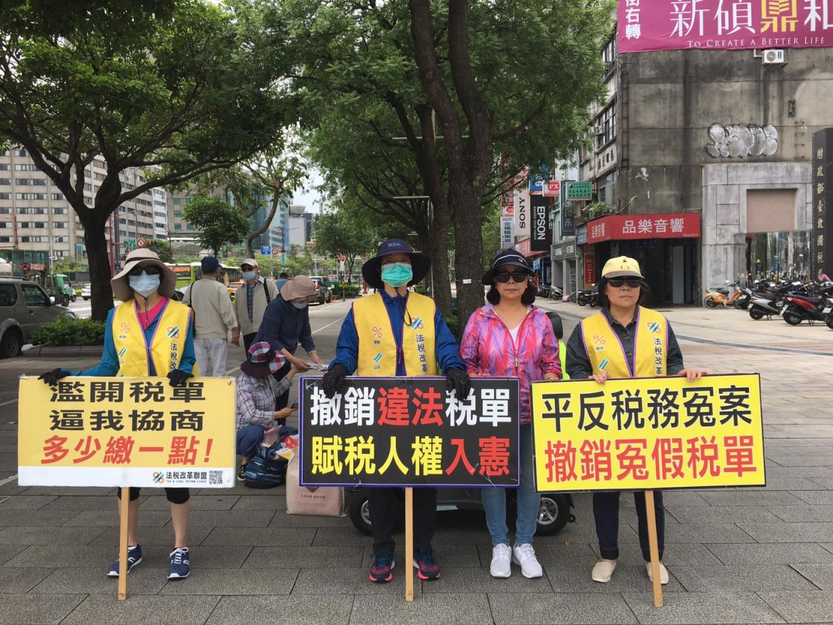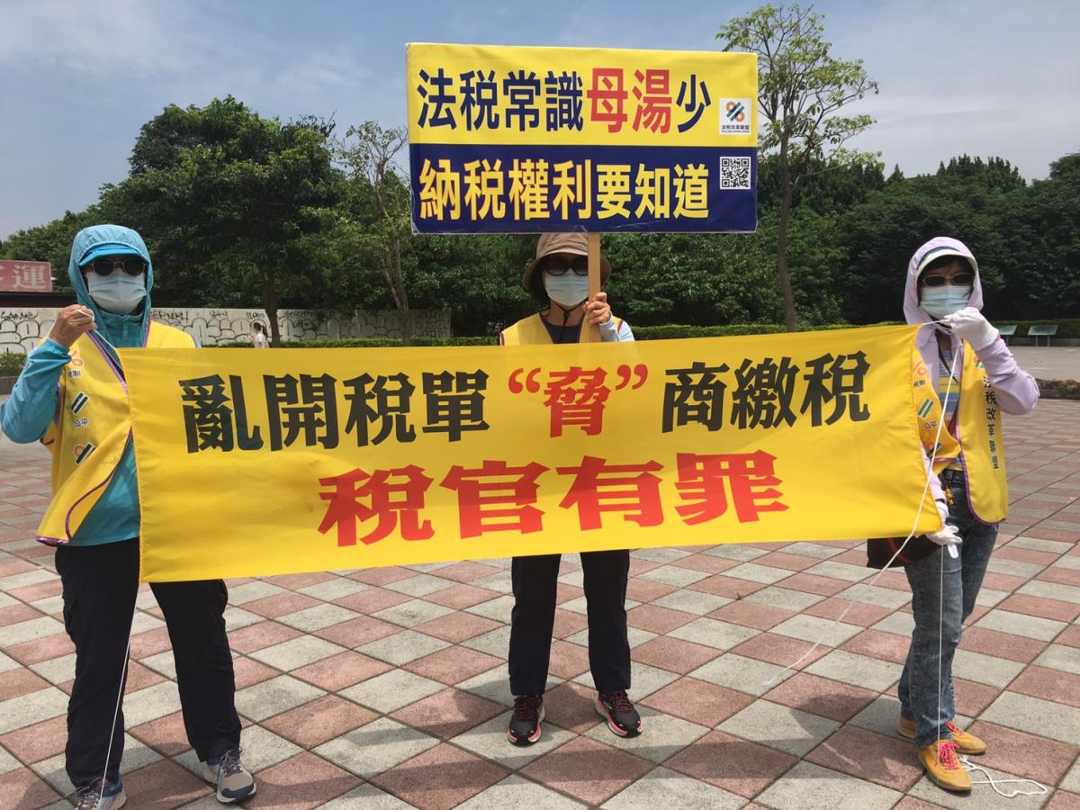 5月報稅季,台北國稅局前,法稅改革聯盟志工不懼驕陽、雷雨,高舉著看板「依法報稅 拒絕惡意〝脅〞商」、「賺錢不容易 報稅要注意!」、「依法納稅是義務 違法課稅要究責」、「稅單會開錯 別當冤大頭」提醒民眾,報稅三要一不:要清楚、要存證、要冷靜、不「脅」商,才能保護自身權利,千萬別被當提款機!