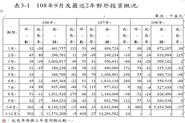 對外投資較去年同期減少36.82%至54.5億美元,金額減少原因主要是去年同期核准遠東境外公司、大成不鏽鋼投資美國分公司、台泥及國巨對外增資等重大投資,基期較高所致。另外,今年前9月對外投資中,對新南向國家投資金額22.6億美元,年增24.4%,其中,金額較大者包括越南、新加坡、澳大利亞及泰國。
