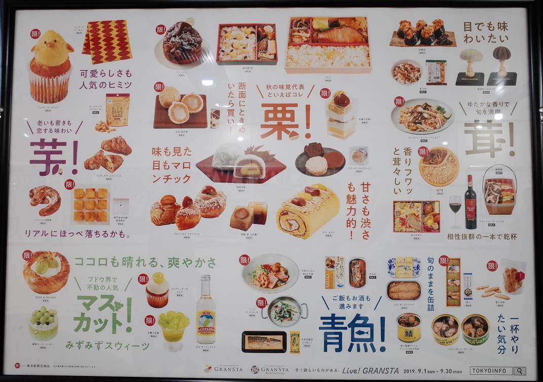 百貨公司的食品樓層的海報,這張海報可以看出日本現在最流行的點心與商品,"青魚"就是鯖魚,鯖魚罐頭正流行,甚至賣到缺貨。