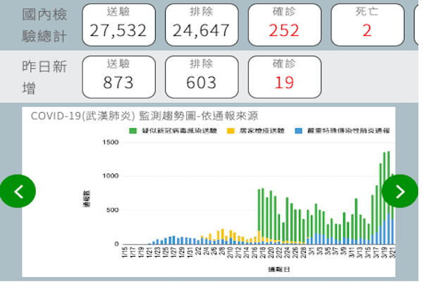 疫情指揮中心表示,今天新增的2例本土個案,案246為60多歲男性,為案209(美國移入)同住家人,無疑似症狀,經接觸者採檢後確診;案247為40多歲女性,為案228(荷蘭移入)同住家人,於3月23日發病,經就醫採檢通報後確診。目前全台累計27,532例(含24,647例排除),其中252例確診,分別為212例境外移入及40例本土病例。確診個案中2人死亡,29人解除隔離,其餘病況穩定,持續住院隔離中。