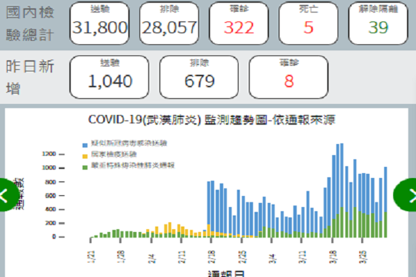 疫情指揮中心表示,昨日(30日)國內新增1,040例新型冠狀病毒肺炎相關通報,截至目前累計有31,800例(含28,057例排除),台灣疫情確診數已達322例確診;確診個案中有5人死亡,39人解除隔離,其餘仍持續住院隔離中。