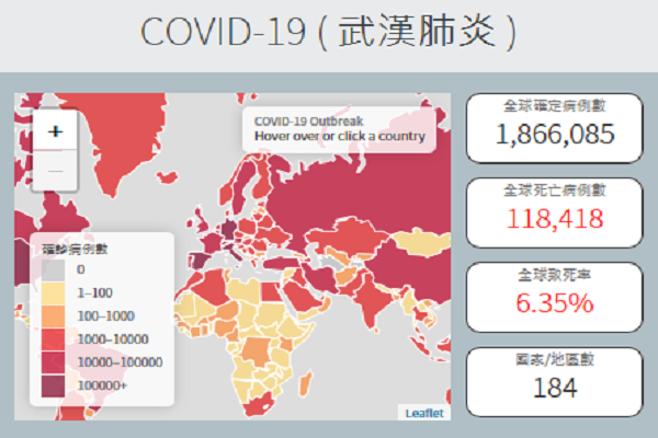 指揮中心指出,全球累計1,866,085例確診,分布於184個國家/地區;病例數以美國580,619例、西班牙169,496例、義大利159,516例、德國123,016例及法國98,076例為多;病例中118,418例死亡,以美國23,529例、義大利20,456例、西班牙17,489例、法國14,967例及英國11,329例為多。