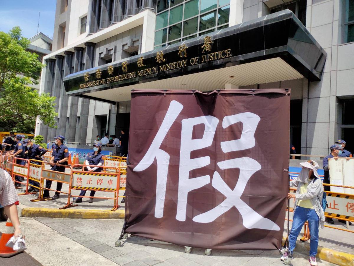 7月8日一早,法務部行政執行總署聚集千位民眾舉牌抗議,「拒絕國家暴力」、「終止24年政治整肅迫害」、「撤銷違法查封」、「拒絕人權迫害」,質疑執行署是掛牌強盜?