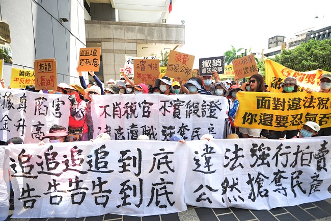 今(10日)天上午,十位太極門弟子由律師陪同至台中地方法院檢察署按鈴申告前中區國稅局副局長蕭樹村涉犯刑法第129條第1項違法徵收罪,僭越職權未遵循上級長官命令撤回違法執行,反而持續違法強徵至今,致告訴人遭受強行拍賣之損害。現場百位民眾拉布條高聲聲援,控訴國稅局違法搶奪民產。