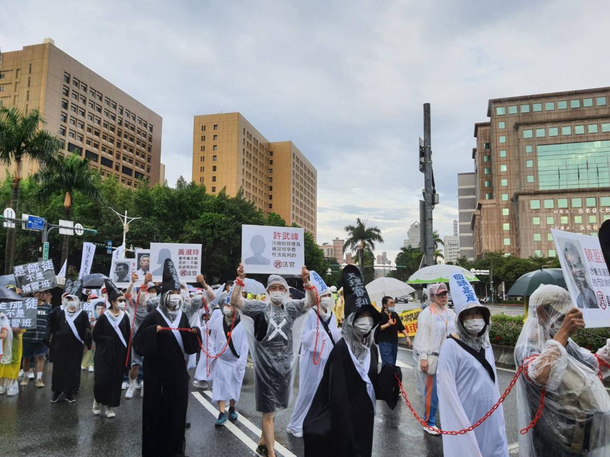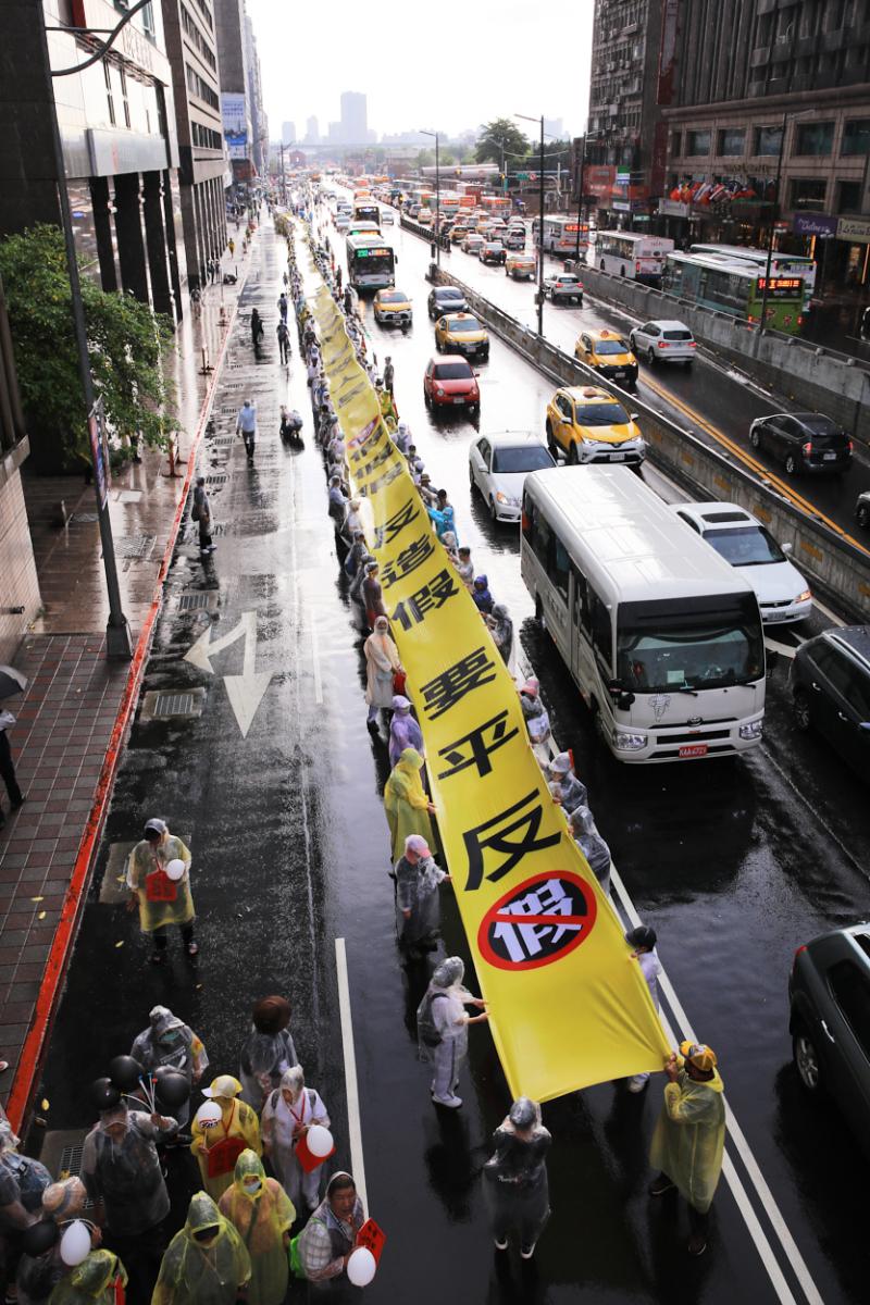 風雨中的台北,出現台灣史上最長達300公尺布條控訴惡官,志工扛著「假假假 反造假 要平反」、「反造假 終止政治整肅迫害」、「反造假 護衛人權 保障信仰自由」,尤其「Redress the Fabricated Tai Ji Men Case」、「平反太極門假案」,控訴24年的整肅迫害至今未解決。