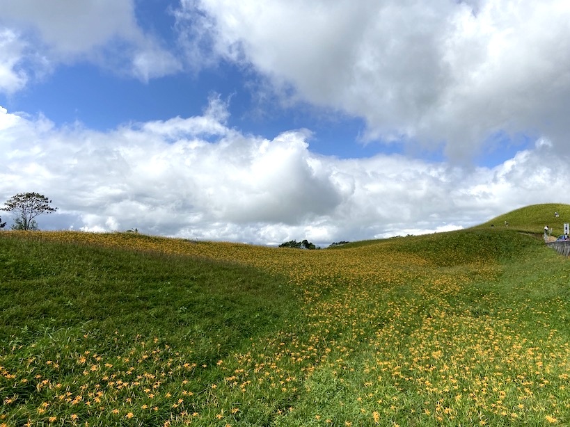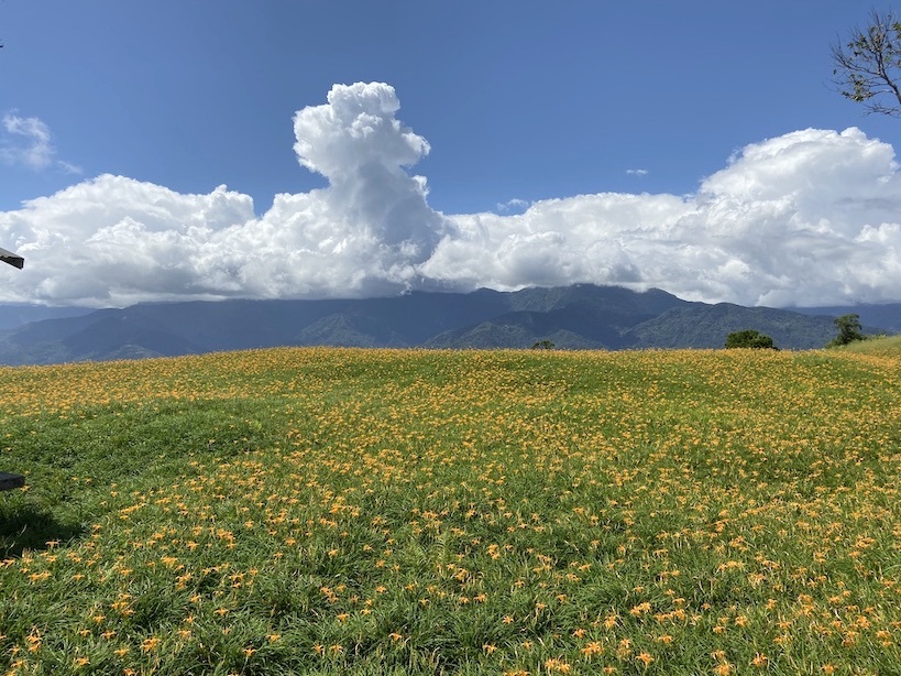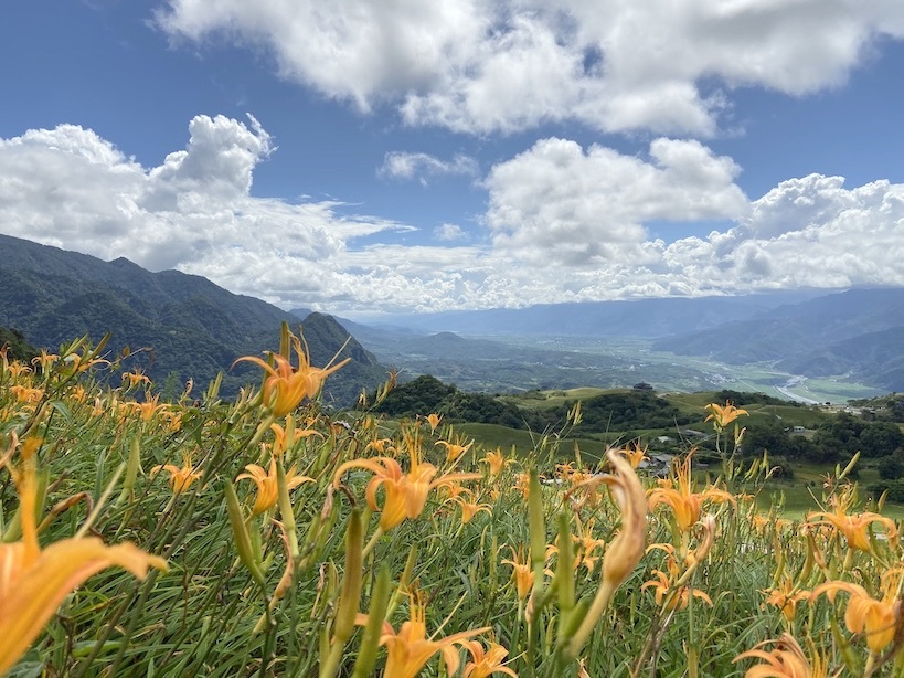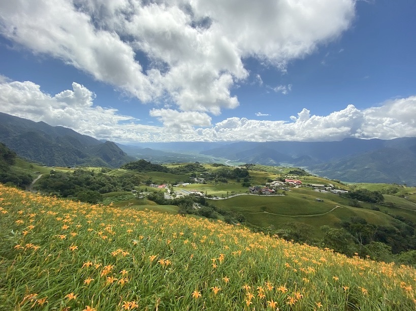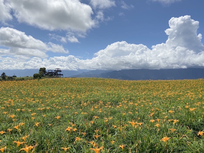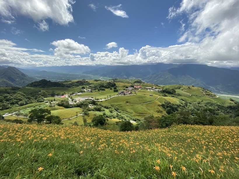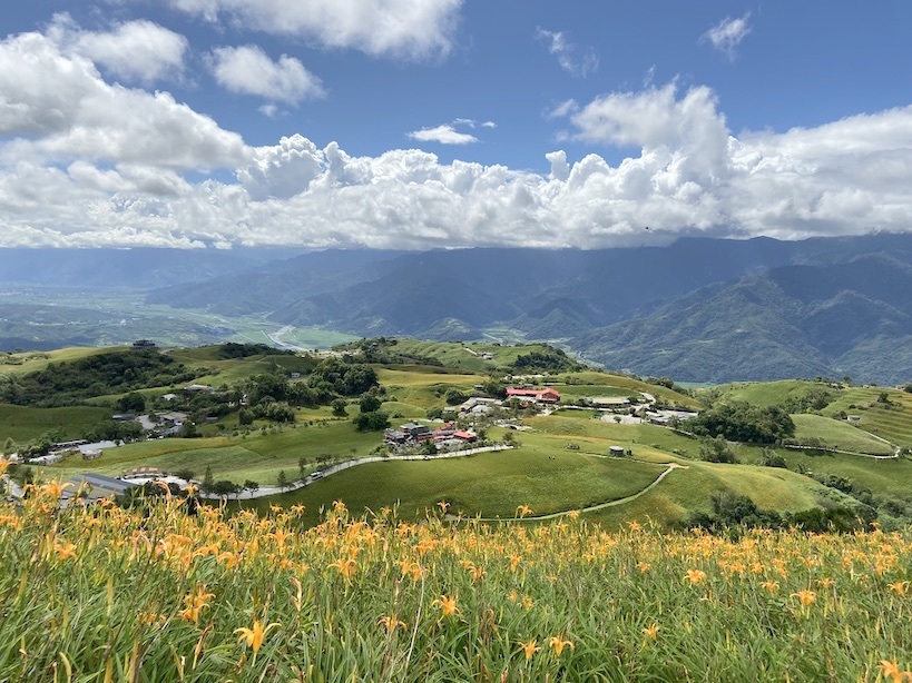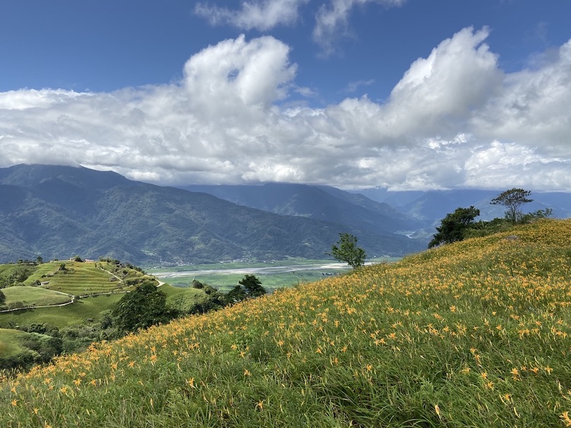 這片被稱為「台灣小瑞士」的風光,一整片金針花與綠葉,舖蓋在起伏的山頂上,點綴著些許的農舍並再配合花東地區特有的藍天與白雲,眺望著花東縱谷,令人神清氣爽。