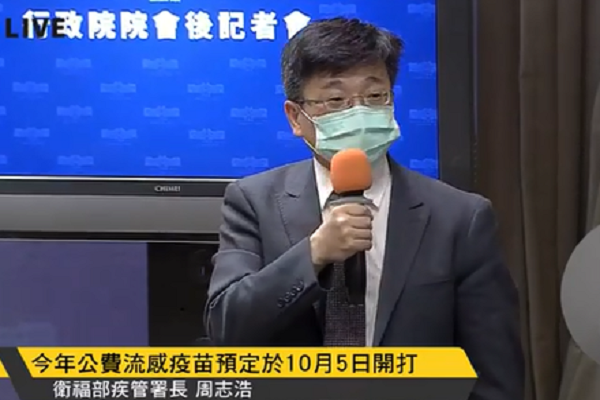 周志浩在今行政院院會後記者會上表示,今年政府機關總共採購633萬劑流感疫苗,可以依照時程掌握疫苗供應進度,預計10月5日全國符合公費施打族群同步全部開打,不像去年有些族群優先施打。去年世界衛生組織對疫苗株選擇延後,造成全世界疫苗供應不及,因此讓有些族群優先開打。今年公費接種對象同樣包含50歲以上成人、孕婦、6 個月以上至學齡前幼兒、學生及潛在疾病患者等。