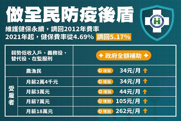 調整後原受政府全額補助約126萬民眾(如低收戶、替代役等),其保費不受影響;受僱者平均每人增加63元,7成以上每月增加70元以內;以月薪24,000元、30,000元、70,000元及180,000元為例,每人每月分別增加34元、44元、105元及262元。【記者 王釋真整理報導】