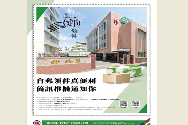 為應宅經濟興起及疫情影響,中華郵政公司今(16)日宣布,將於本月24日推出「自郵領件」服務,初期選擇60處郵局為收件人地址,並於郵件到達時,通知收件人領取,寄件人可享國內包裹、國內快捷減收資費新台幣22元優惠。