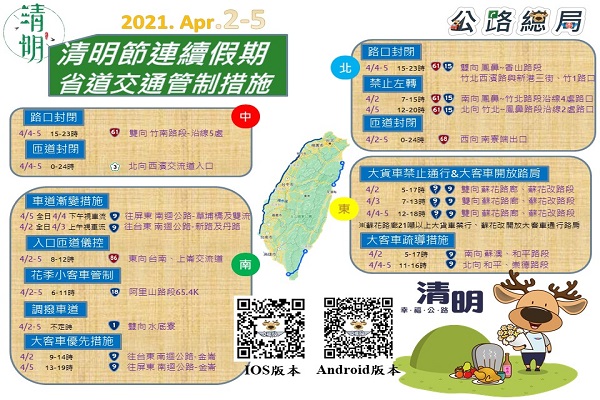 110年清明節連續假期即將到來,公路總局盤點歷年清明節假期容易發生壅塞的路段,總計19處,預估各路段壅塞日期、時段,同時也規劃交通管制措施,以提高公路疏運服務效率。相關資訊公路總局已製作宣導懶人包,提供民眾於返鄉或出遊前可事先做好規劃,避開尖峰時段行駛,並注意各項交通管制措施。