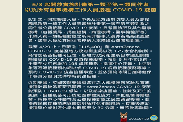 指揮中心今(29)日表示,因某航空公司機師的同住家人接連確診,5月3日起開放醫護人員、中央及地方政府防疫人員及第一線防疫人員等公費接種COVID-19疫苗。