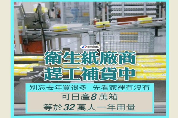 經濟部表示:國內衛生紙年產能約20萬噸,平均日產量約8萬箱,經向主要製造商瞭解,目前紙廠皆備有庫存,原料存量約1-2個月。防疫酒精庫存仍有45萬瓶,酒精原料庫存達220萬公升,每日產能為15萬瓶,預估14天內日產能可達20萬瓶,產品價格不變,民眾可至各門市及相關通路購買。泡麵國內平均日產能11萬箱,罐頭食品廠商庫存量足以應付短期消費者需求,並已備妥原物料。