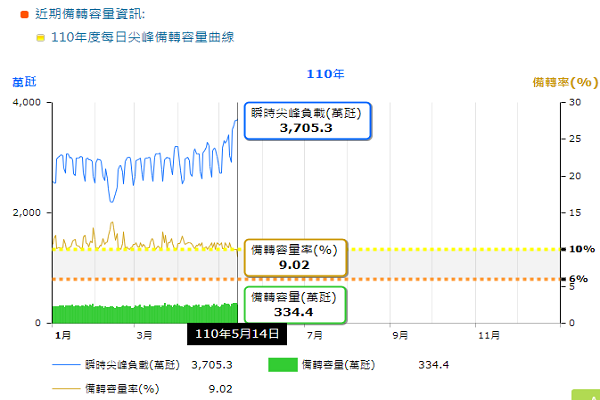 台電進一步說明,今年需求方面因受疫情影響,民眾轉趨國內消費,內需經濟成長、外銷暢旺,帶動國內負載成長,工業用電更大幅增加。台電指出,今年1~4月售電量為704.31億度,較去年同期增加31.29億度,成長4.6%;另一方面,今日瞬時尖峰負載達到3705.6萬瓩,不僅超越去(109)年5月尖峰負載紀錄3379.1萬瓩,更突破歷年5月份最高用電紀錄。
