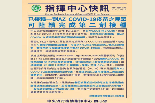 指揮中心表示,根據世界衛生組織( World Health Organization, WHO)與醫學期刊「刺胳針」(The Lancet)等國外臨床試驗資料分析顯示,完成兩劑AZ COVID-19疫苗(間隔 80 天)的追蹤結果證實,可預防6成以上有症狀感染之風險;當接種間隔 12 週以上且完成 2 劑接種,保護力可達 81%。基此,我國衛生福利部傳染病防治諮詢會預防接種組(ACIP)專家建議兩劑AZ COVID-19疫苗接種間隔至少8週,而間隔10至12週再接種第二劑疫苗的效益更佳,故指揮中心籲請民眾可於第一劑接種後10-12週完成第二劑接種,使疫苗發揮最大效益。