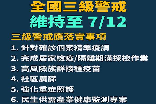 國內疫情爆發後,全台自5月19日進入三級警戒,不斷後延至6月28日,外界無不討論「局部解封」、「微解封」的可能。中央流行疫情指揮中心今(23)日宣布,因新冠肺炎跨區傳播事件仍然存在,世界各國因解封太快致疫情再起的經驗亦歷歷在目,為確保國人健康,經評估後決定,全國疫情三級警戒延至7月12日,希望用2週的時間換得全民平安,呼籲國人共體時艱,共同抗疫,一起努力達到疫情平穩。