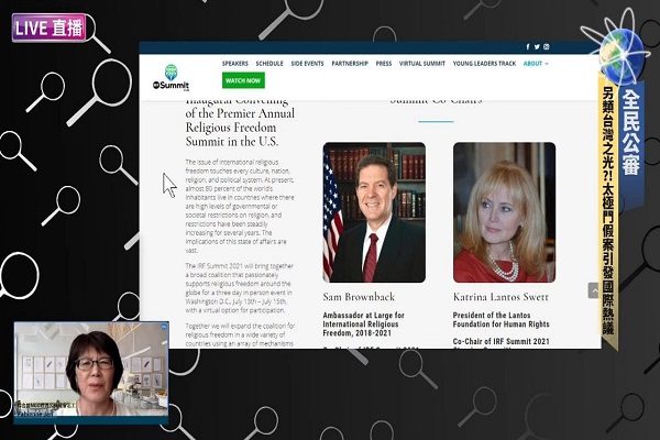 Fabienne Jen也介紹這場高峰會主要人物,主要由前「無任所大使」Sam Brownback和Lantos人權基金會主席Katrina Lantos Swett共同舉辦,還有四位參眾議員合辦,其中Chris Coons參議員即為專程來台宣布美國疫苗援台喜訊的成員之一。前美國國務卿蓬佩奧Pompeo及眾議院議長Nancy Patricia Pelosi,也都在會議中發聲。Fabienne Jen指出,這一場會議有一個重要的slogan,強調全世界不管任何人、任何地方,都能夠享有宗教信仰的自由,每個人都有權利選擇自己想過的生活;想要追求的信仰,甚至沒有信仰都要被尊重。Fabienne Jen強調,這場會議非常嚴格,ACT1219經過嚴格的審查,獲得通過才能參加,而ACT1219提出來的太極門案件,也成為獲得國際關注的很重要的一個指標性案件。