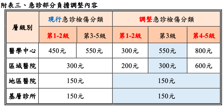 在急診部分負擔方面,在醫學中心及區域醫院,調降急診檢傷分類「第1-2級」部分負擔,從450元分別調降為300元、200元,「第3級」維持550元、300元,「第4-5級」從550元調高為800元、600元,影響人數約117萬人(詳附表三)。