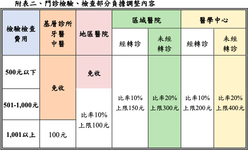 門診檢驗、檢查部分負擔,經轉診至醫學中心或區域醫院收取10%部分負擔,醫學中心最多收200元,區域醫院最多收150元。但未經轉診至該二類醫院,將收取20%的部分負擔,前者最多收400元,後者最多收300元。地區醫院500元以下免收,501元以上收取10%,最多收100元。西醫基層診所、牙醫及中醫之檢驗、檢查費用1,000元以下,免收部分負擔,1,001元以上收100元,影響人數約981萬人(詳附表二)。