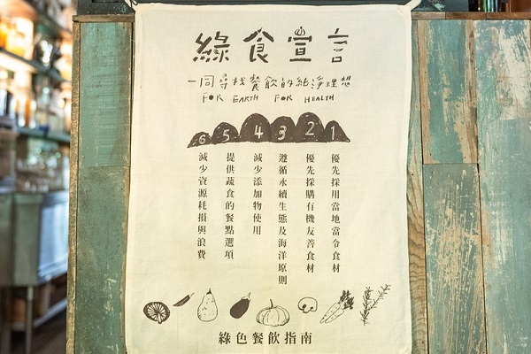 民以食為天,企業響應永續行動,自然也不能忽視飲食這一塊。而在員工餐廳推動綠色飲食,是最快、最直接的方式,讓員工「吃的每一口都是在減碳」。為此,宏國德霖科技大學餐旅管理系、崇越科技、啓碁科技、瑞恩帝兒幼兒園與蕓慶企業與台北市文化探索協會共同響應「綠食宣言」,遵循包括優先採用當地當令、有機友善食材、遵循永續生態及海洋原則、減少添加物使用、提供蔬食選項、減少資源耗損與浪費等六大準則,加入綠色餐飲行動。