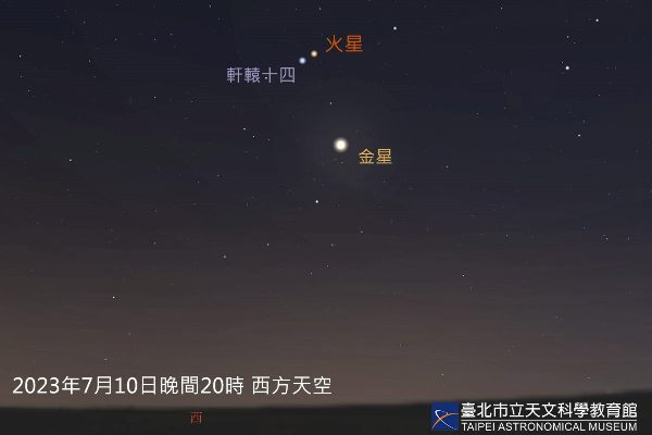 7月10日傍晚的西方天空則會上演多場肉眼可見的精彩天象,包括達到最大亮度的金星、火星「合」一等亮星軒轅十四,以及明亮的國際太空站劃過夜空!當晚金星亮度達-4.7等,是今年內能觀賞到這顆行星最亮的一天。金星上方紅色的火星亮度約1等,與獅子座主星軒轅十四相距僅約0.7°,兩顆亮度相近、顏色卻大相逕庭的亮星難得巧遇,相當特別。20時26分至32分左右,夜空最吸睛的主角換為國際太空站,屆時這架長達百米、載著7位太空人的太空站,將從約450公里高的軌道上越過臺灣海峽上空,由西南向東北方緩緩劃過天際,亮度可達-3.4等,由於此時金星和火星都已落至低空,國際太空站成為夜空中最明亮的物體。