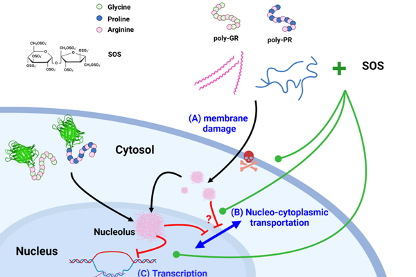 由於神經細胞無法再生,提高細胞存活率是一種治療方向。研究團隊自基因體研究中心洪上程特聘研究員建置的硫酸乙醯肝素分子庫,篩選出一個硫酸雙醣分子(Sucrose Octasulfate, SOS),並作用於神經母瘤細胞、漸凍症病人多功能幹細胞分化的運動神經細胞,成功減緩由poly-GR/-PR所引發的神經毒性。