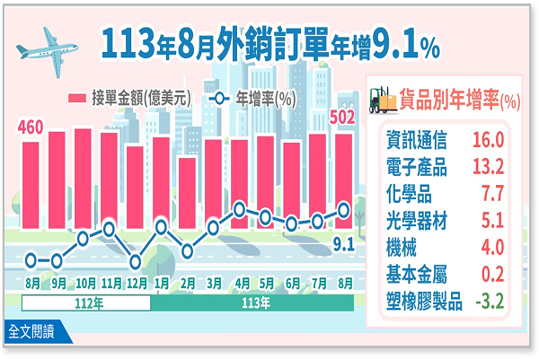 受惠人工智慧(AI)、高效能運算以及雲端產業等需求持續,以及消費性電子新品備貨效應,經濟部24日公布8月外銷訂單金額502.2億美元,為歷年同月第3高,年增9.1%,連6個月正成長;1至8月外銷訂單3751.1億美元,年增3.5%。