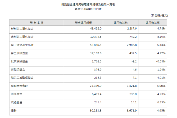 勞動部勞動基金運用局1日公布整體勞動基金最新績效,截至今年8月底,整體勞動基金規模為7兆3389億元,收益數為3422億元,收益率為5.00%,8月單月收益超過2700億元。
