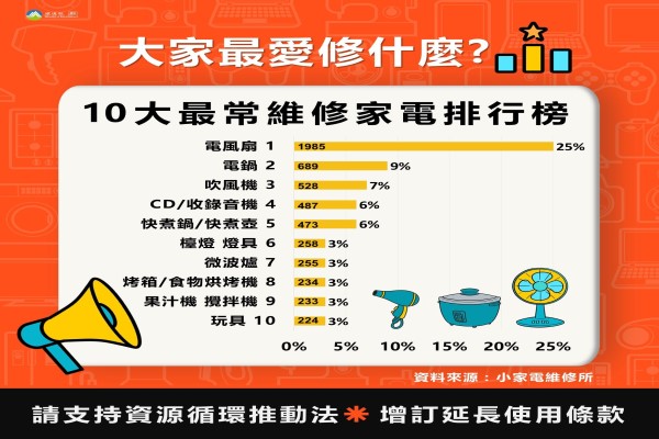 環境部次長兼任環資會董事長葉俊宏指出,維修是「減廢、減碳」最省錢、最有效、最簡單的方法;而日常生活中哪些東西最常維修呢?維修團體公布了近年來民眾最常維修的前十大小家電排行榜,第1名為電風扇,第2名至第10名依序是:電鍋、吹風機、CD/收錄音機、快煮壺/鍋、檯燈/燈具、微波爐、烤箱/食物烘烤機、果汁機/攪拌機、玩具。