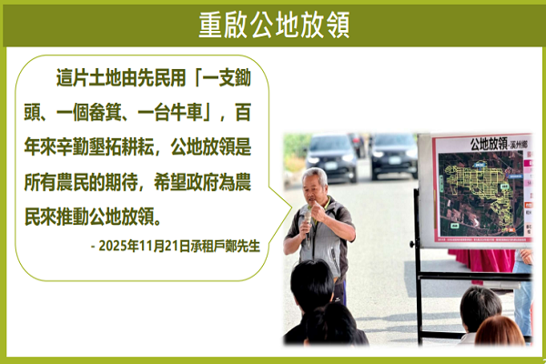 卓榮泰表示,推動此政策的核心在於「土地正義」與「保障人民財產權」,政府有責任將農地歸還真正耕作的農民,並以制度化方式兼顧國土復育、環境保育,與照顧農民權益。政府為扶植自耕農,自1948年起推動3階段「公地放領」政策,釋出超過125萬公頃公有土地,讓農民以分期方式取得耕地所有權。不過,因921地震及多起大規模風災,基於國土保育考量,政府自2008年起,全面停辦公地放領,至今已17年。