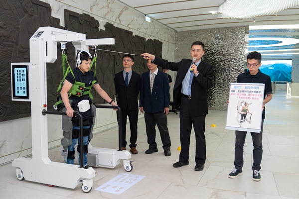 在國科會支持下,自2016年起,跨校團隊以神經可塑性理論、安全控制、AI與腦機介面為核心,結合外骨骼與運動意圖辨識模組,完成AI隨動步行復健機器人(HopeStride)開發。系統能依患者狀況於不同復健階段靈活調整訓練模式,分為初期、中期與後期,從協助站立與平衡、啟動下肢運動,以影像輔助步態引導,建立自然的行走模式與正確的重心轉移,到最後透過腦波訊號主動驅動外骨骼,實現「意念控制行走」。