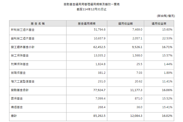 勞動基金運用局今(2)日公布114年12月勞動基金績效,單月大賺1,415億元;全年收益高達1兆1,177億元,收益率達16.06%,已連續兩年收益數破兆元,整體勞動基金規模為7兆7,925億元。