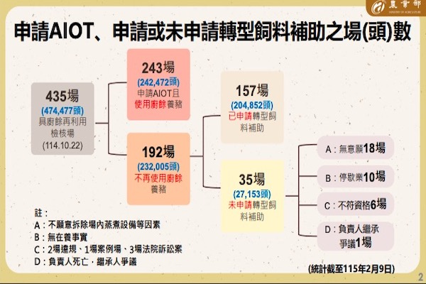 卓院長說明,政府確立「廚餘養豬轉型」政策方向,農業部及環境部在今(115)年1月啟動廚餘養豬轉型計畫。從今日報告可知,原有435場廚餘養豬場,已有192場表達不再使用廚餘養豬,占48%的豬隻頭數,短期內已初步顯現績效。卓院長指示,後續仍請相關部會及地方政府,持續以最高標準落實非洲豬瘟防疫工作,強化廚餘去化各項管理環節,推動我國養豬產業轉型升級、穩定市場供應並接軌國際。